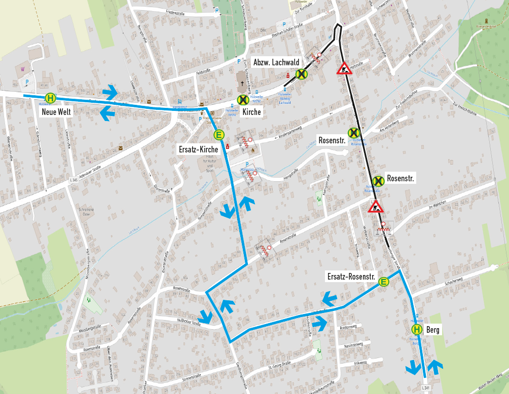 Für die Haltestelle HÜLZWEILER ROSENSTR. nutzen Sie bitte alternativ die eingerichtete Ersatzhaltestelle in der "Hochstr." in Höhe von Anwesen Nr. 3